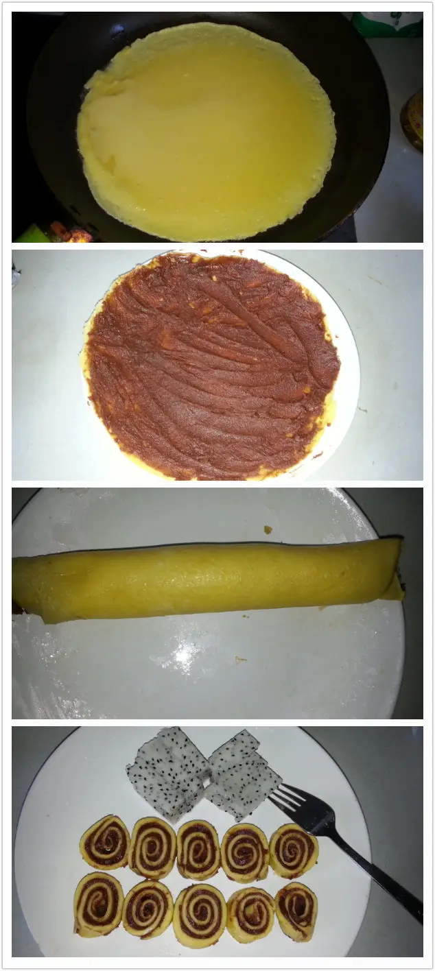 这款早餐是纯甜口儿的!鸡蛋、面粉、白糖调成面糊,平底锅刷油小火摊成蛋饼,豆沙陷加牛奶调稀一点儿,太稠不容易抹开,抹好豆沙馅的蛋饼卷起来切段装盘就完成了!牛奶加燕麦片加冰糖微波炉里叮两分钟即成了美味又营养的牛奶燕麦粥!