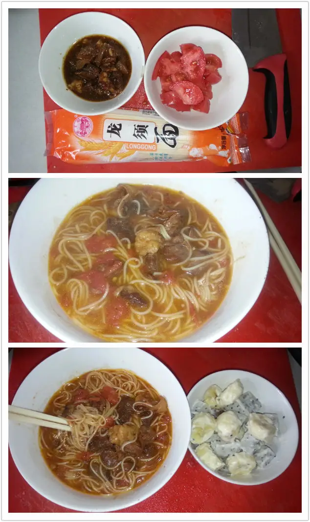 头天晚上剩下的炖牛肉当汤头,西红柿炝锅,炖牛肉和挂面一起下锅煮,盐、鸡精、香油、调味出锅,外加香蕉火龙果沙拉!吃的盆干碗儿净!