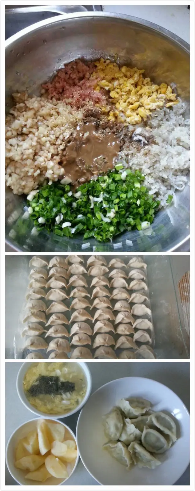 提前包好的茄子、粉条、鸡蛋、香肠、麻酱馅饺子,冻到冰箱里,哪天起晚了来不及做早餐的时候,可以给宝贝煮来吃,配上紫菜蛋花汤和苹果,也算营养又美味了!