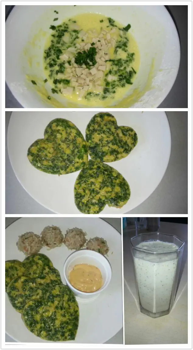 在超市买的心型模具,两个鸡蛋、两勺面粉、菠菜碎、火腿碎、花椒粉、盐、香油,全部搅拌在一起,平底锅及模具刷上油,倒入面糊小火慢慢煎,表面凝固后取下模具翻面煎一下即可!出锅配千岛酱吃!头天晚上吃剩的珍珠丸子,外加香蕉、火龙果奶昔!这两种水果在一起打奶昔是绝配,甜度和口感恰到好处!妈妈们可以试 一试!
