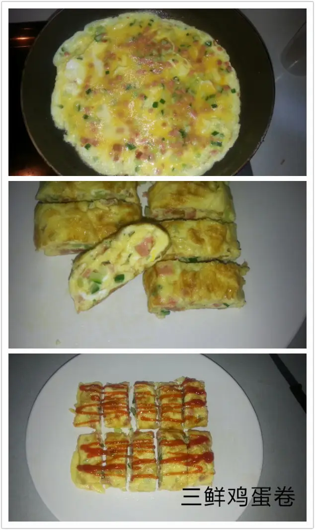 简单又营养,两个鸡蛋、黄瓜碎、火腿碎、花椒粉、盐、香油搅拌在一起,平底锅小火摊成一个饼片,不翻面、待蛋液快要全部凝固的时候把蛋饼卷起来,装盘切段淋上番茄沙司!完成!