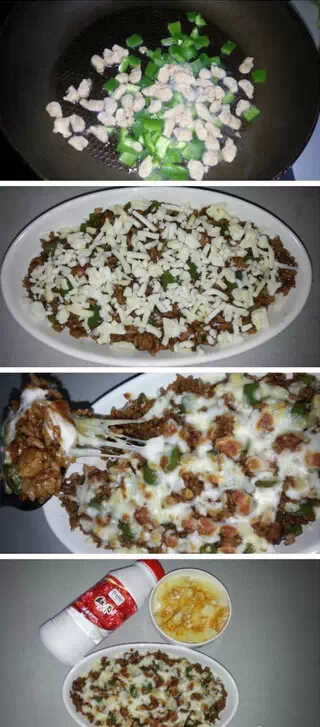 青椒丁、牛肉粒、米饭、甜面酱、黑胡椒一起炒,最后加少许盐和香油调味出锅、在炒好的米饭上铺上一层马苏里拉奶酪,入烤箱220度上火烤五分钟即可!再搭配一份哈密瓜和一瓶酸奶!