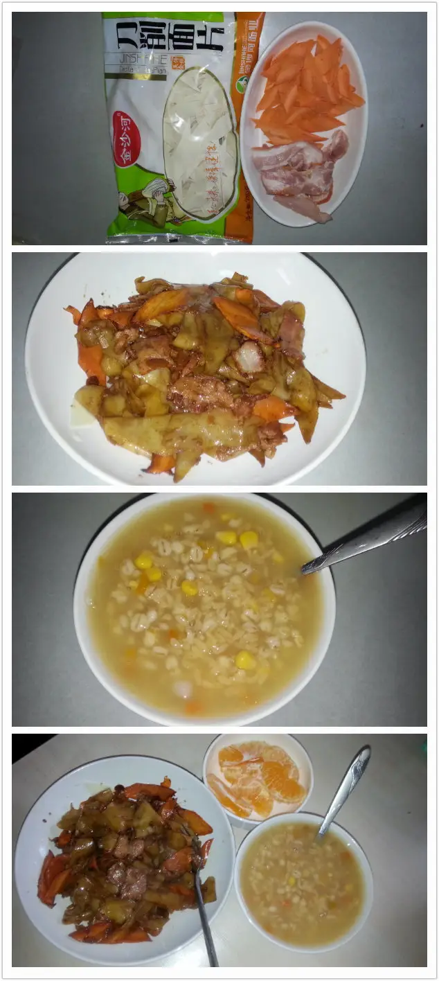 超市买的干面片,煮熟后捞出备用,培根片爆香、胡萝卜片、面片、黄豆酱、均匀炒熟后点香油出锅!搭配一碗玉米燕麦杂粮粥和一份非常败火的丑桔!