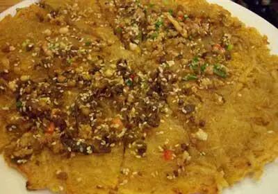萝卜饼,是云南民间小吃,以发面、酥面为 皮,包入萝卜、丝馅,煎制而成。成品做工考究, 色泽金黄,外焦里嫩,鲜香可口,经济实惠。