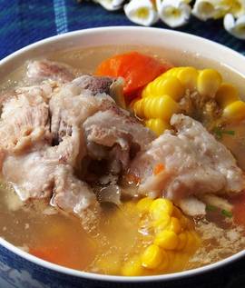 原材料:玉米棒150克,排骨250克,红萝卜50克,生姜、红枣少许